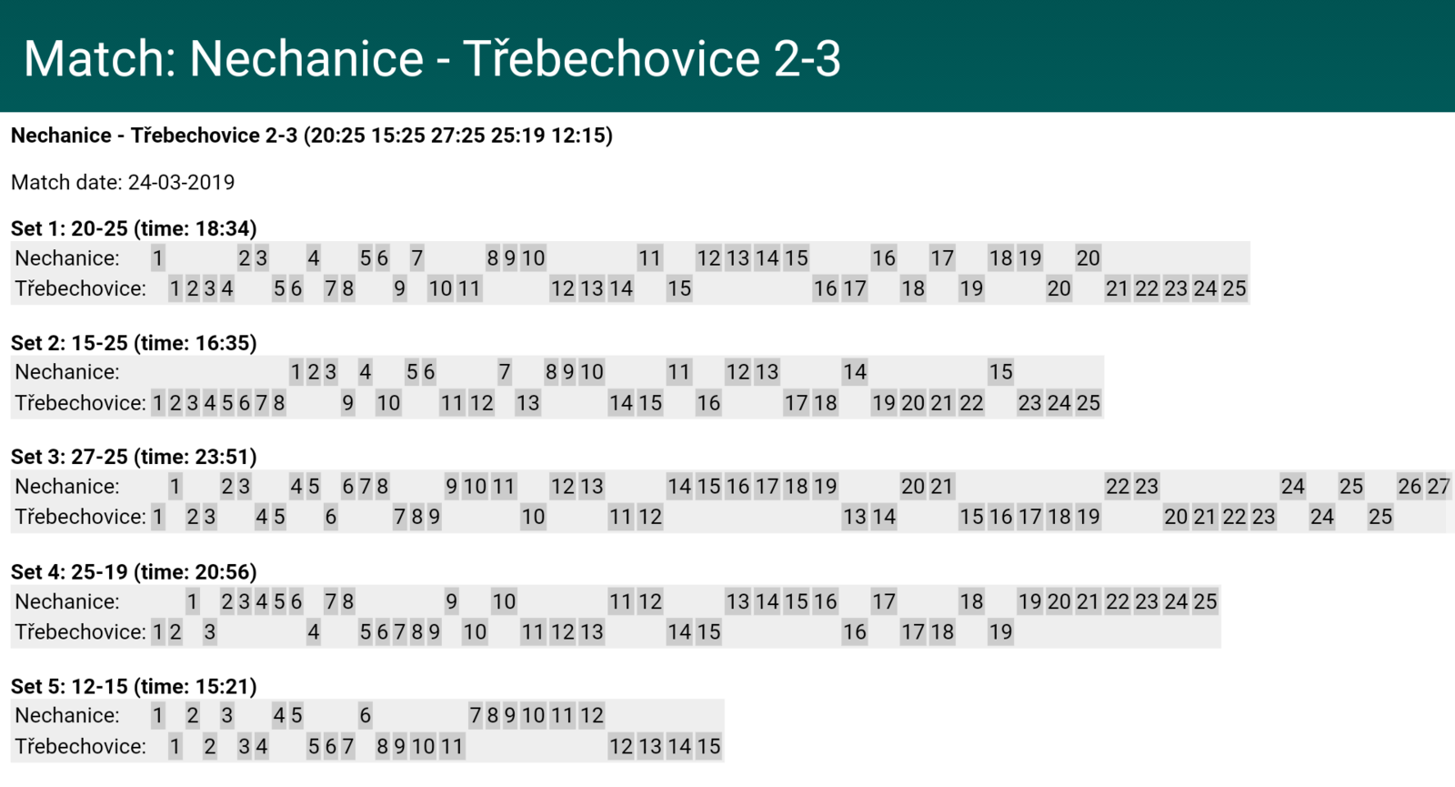 Hned první set ukazoval, že by mělo jít o zajímavý zápas, ve kterém bychom mohli bodovat. Bohužel, i když Třebechovice nekladly odpor a nám se dařilo pěkně ztrátovat, set jsme těsně prohráli. Do druhého setu jsme šli s jasným cílem. Méně chybovat a dále využívat slabinu soupeře, kterou byly zalejvky na „náměstí“. To se nám povedlo dokonale, a již v polovině setu jsme měli slušný náskok, který jsme si udrželi až do konce. Nevím, co se stalo, ale třetí a čtvrtý set byla v našem podání naprostá katastrofa. Zhoršili jsme se na přihrávce a prakticky neútočili. Sice se nám dařilo ubránit některé pěkné útoky soupeřek, ovšem ani to nezabránilo vysokým prohrám 13:25.